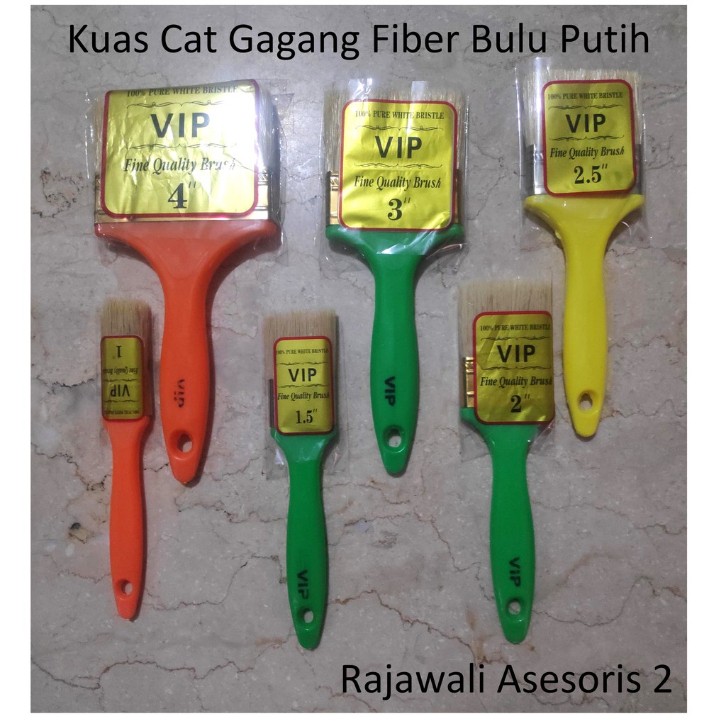 Koas / Kuas Cat Gagang Fiber Bulu PutihMerk VIPGagang Fiber (Ringan & Nyaman saat digenggam)Bulu PutihUkuran yang tersedia 4", 3", 2.5", 2", 1.5", 1"Harga pe