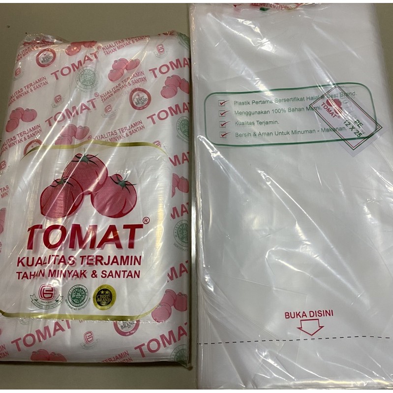 PeTomat bersifat alastis dan warna sedikit butek, plastik ini cocok untuk menyimpan makanan berminyak, es batu. plastik ini memiliki berbagai macam ukuran yaitu ukuran : -10x20, 12x25, 15x30, 17x35, 20x35 dan
