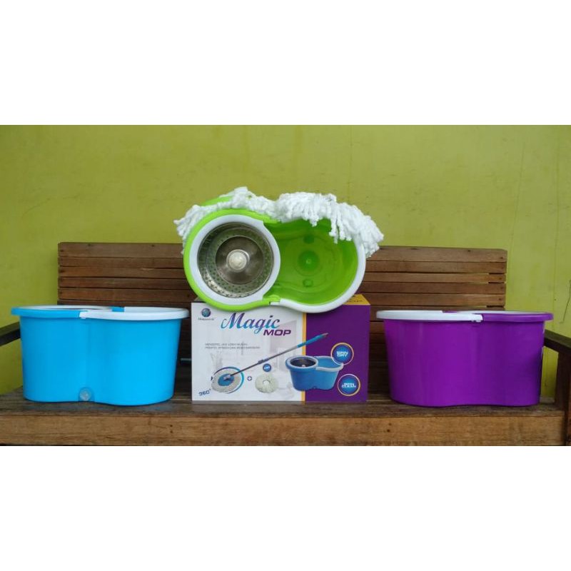 WARNA RANDOM YA.. DIUSAHAKAN ADA YANG DIMINTA KINI HADIR New generasi mop didesain lebih sempurna terdapat : kunci flip, spin peras stainless, ember roda, 2pc kain pel.adalah alat pel lantai yang dapat berputar 360 derajat, anda tidak perlu memeras air pel dengan tangan, cukup menekan tongkat pel pd tempatnya maka kain pel lantai akan terperas dengan sendirinya, praktis gak capek dan tidak mengotori tangan.Spesifikasi Produk:- Name Brand : MATSUNICHI- Tongkat Stainless- Kunci Flip- Mangkok peras stainless steel- Ember dilengkapi roda- 2pc kain pelIni sangat ideal untuk membersihkan semua jenis permukaan keras.Marmer, genteng, dan Lantai kayu keras, jendela, Furniture,mobil dan banyak lagi! Yang sederhana dan mudah! Pembersihan tidak lagi tugas ketika Anda telah Magic Mop! Mikro unik-serat kain pel pusat super penyerap dan sangat tangguh untuk kotoran, rambut kotoran, dan noda!Keunggulan :- Powerfuul berputar sampai dengan 360 derajat.- Ember terbuat dari bahan plastik berkualitas tinggi lebih TEBAL- Praktis tidak membuat tangan kotor.- lantai cepat kering dan bersih setelah mengepel.- Menghemat waktu pengerjaan tidak perlu peras tinggal tekanUkuran kotak : 26 x 46 x 26 cmBUNGKUS se