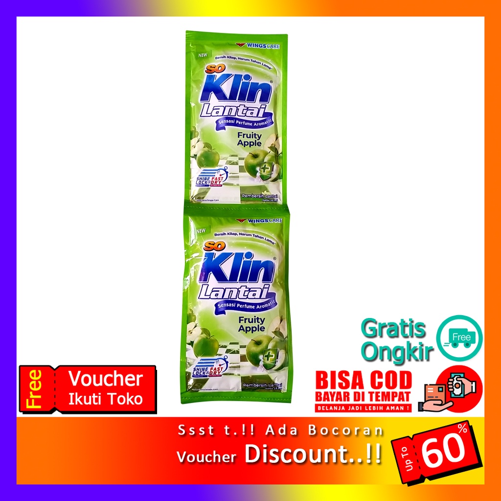 Promo | Soklin Pembersih Lantai 25 mL | MURAHRasakan Sensasi Keharumannya..!*Harga yang tertera diatas adalah harga per SachetDetail produk: So Klin Lantai membersihkan lantai hingga maksimal. Plus Sensasi Perfume Aromatic Fruity Apple dan Rose Bouquet yang menghadirkan aroma manis buah apel dan nyaman dengan keharuman tahan lama hingga ke sudut ruanganCara Penggunaan:1. Untuk lantai ruangan, tuangkan So Klin Lantai Sensai Aromatic dalam air2. Untuk kamar mandi, gunakan So Klin Lantai Sensai Aromatic tanpa diencerkan dahuluKEUNGGULAN:1. Anti kuman 2. Teknologi Fast Dry membuat lantai cepat kering kurang dari 1 menit 3. Shine lock Formula membuat lantai bersih dan kilap 4. Harum yang tahan lama hingga 4 jam#soklinpembersihlantai #pembersihl