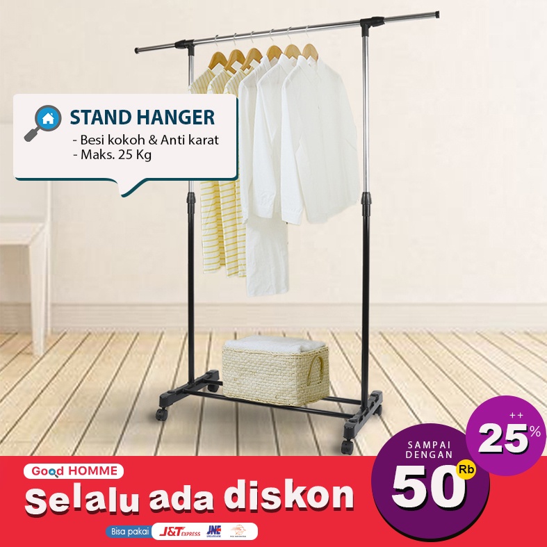 Stand Hanger Rak Tempat Gantungan Jemuran Baju Pakaian Gantung Gawang SerbagunaSILVER + RODA : Bahan stainless dan plastikHITAM + RODA : Bahan besi (cat hitam) dan plastikStand hanger single rak Serbaguna dengan 4 rodaModel standing, bisa untuk gantungan pakaian, tas, jas, topi, dasi dan aksesoris atau apa aja yang bisa digantung. Model standing lebih modern dan irit tempat, bisa dipakai di rumah atau di kantor.Yang silver dari bahan stainless steel,yang hitam bahan besi(cat hitam) , bisa dipakai untuk jangka waktu lama, kuat dan kokoh. Pemasangan sangat mudah.Tidak termasuk hanger bajuSpesifikasiSize :tinggi : 80 - 155 cmlebar : 80 -155 cmmax berat :