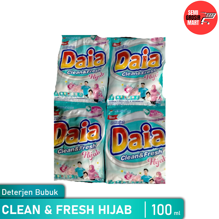 6 keunggulan Daia Deterjen Bubuk Clean & Fresh Hijab : * Bersihnya all out * Busa melimpah * Warna stand out * Lembut di tangan * Wangi tahan lama * Anti apekED : April 2023Frequently Ask :Kenapa beli produk kami ?Kenapa produk kami lebih Murah ?- Semi Grosir-Mart adalah toko online yang menjual produk Daia Deterjen BubukClean and Fresh Hijab 51g Isi 6 Extra 1 dengan HARGA GROSIR.- Semua barang yang ada di toko Semi Grosir-Mart adalah READY STOCK. Sehinggakami mendapatkan harga Daia Deterjen Bubuk Clean and Fresh Hijab 51g Isi 6 Extra1 yang jauh lebih murah dipasaran.- Barang yang kami jual dipastikan 100% ORIGINAL Daia Deterjen Bubuk Clean andFresh Hijab 51g Isi 6 Extra 1.- Sebagai Distributor Produk kebutuhan sehari-hari atau retail yang sudahberjalan bertahun-tahun secara Online. Kami pastikan menjaga kenyamanan andaberbelanja dengan PRODUK ASLI dengan HARGA MURAH.Note:*Melakukan pesanan dan pembayaran kami nyatakan pembeli sudah membaca informasiproduk yang sesuai dengan judul dan deskripsi yang kami berikan.*Pembeli menyetujui dengan peraturan toko untuk masalah jam operasional.*Pembeli menyetujui retur barang yang rusak sesuai dengan peraturan