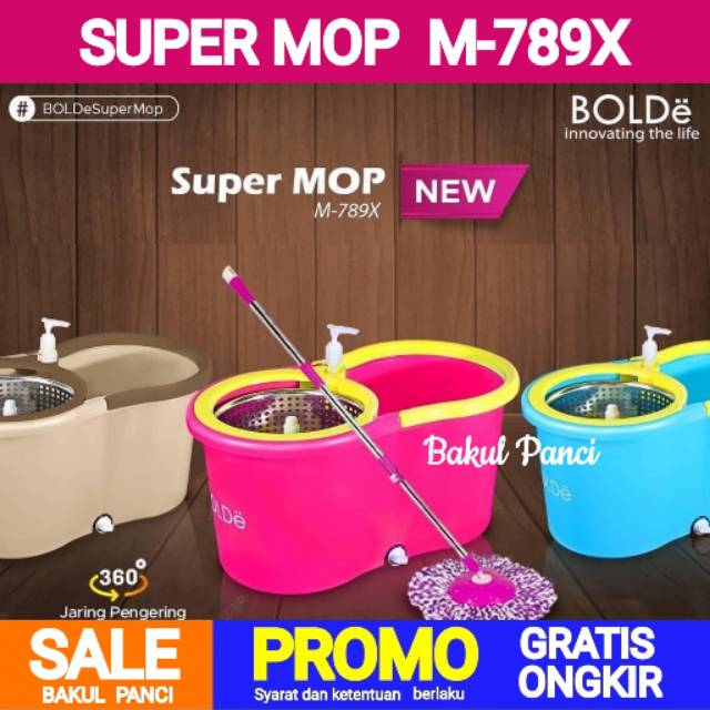 Alat Pel Super MOP BOLDe M 789 - Botol Dispenser - Drainase- Best Seller! Sangat ekonomis.- Alat pel modern zaman NOW!- Ringan & kokoh dibuat dari bahan plastik berkualitas baik.- Tongkat pel lebih besar dan kokoh berbahan stainless.- Saringan anti karat berbahan stainless.- Kain pel microfiber 2 (dua) pcs.- Disediakan dispenser botol sabun/pewangi lantai.- Mempunyai lubang pembuangan air pel.- Kapasitas 5 liter.- Tersedia pilihan warna Pink, Biru, dan Beige- Jika tidak memilih warna akan dikirim berdasarkan persediaan yang ada.Kelengkapan Paket:- 1 Bucket (Ember) Super Mop M-789.- 1 Karet Drainase (sudah terpasang).- 2 Tongkat Pel Sambungan.- 2 Kain Pel Microfiber.- 1 Headmop Disk.- 1 Lembar Petunjuk (Indonesia).- 1 Dus Produk.DISTRIBUTOR RESMI BOLDe !NOTE :- TIDAK BERGARANSI.- KAMI MENGIRIM BARANG DALAM KONDISI BAGUS, JIKA TERJADI KERUSAKAN PADA SAAT PENGIRIMAN ITU DILUAR TANGGUNG JAWAB KAMI.- KAMI TIDAK MENERIMA RETUR ATAU KOMPLAIN DALAM BENTUK APAPUN.- JIKA WARNA YANG DIPILIH KOSONG, KAMI AKAN MENGIRIMKAN WARNA SESUAI DENGAN PERSEDIAAN YANG ADA SAAT ITU.- ATC / ORDER BERARTI = SETUJU..!!!Terimakasih,BAKUL PANCI#alatpel #alatpellantai #supermop #supermopbolde #supermopdeluxe #supermop169x #supermopboldemurah #alatpelpraktis #alatpelotomatis #alatpelputar #supermopmurah #wondermop #magicmop #supermoporiginal #alatpelmodern #alatpelspraymop #pellantai #pellantaispraymop
