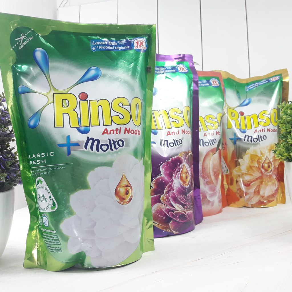 Rinso Cair + Molto 750 mlBaru ! Double Clean Fresh - Melindungi pakaian dari bakteri dan menghilangkan bau tak sedap - Cepat hilangkan noda menbandel ( hanya dengan 1X kucek ) Menyegarkan kembali pakaian anda dengan keharuman segar tahan lama Molto. Nikmati aroma Violet Raspberry dan Rose Berry yang memikat dan mempesona di setiap cucian anda Dapatkan 8 Keunggulan Rinso Cair 1. Cairan Mauk ke serat kain terdalam, tidak meninggalkan residu 2. Membersihkan noda lebih cepat hanya 1x kucek 3. Teknologi SmartFoam baru menghemat hingga setengah air bilasan 4. Menjaga warna pakaian tetap cemerlang 5. Lembut di tangan 6. Formulasi yang ramah lingkungan 7. Menyegarkan kembali pakaian dengan keharuman tahan lama Molto 8. Melindungi pakaian dari bakteri dan bau tak sedap hanya dengan 1x kucek Tersedia dalam 5 varian:* Classic Fresh. Perpaduan wangi bunga melati dan mawar putih.* Jappanese Peach yg lg hits. Perpaduan wangi peach dan bunga sakura* Perfume Essence yg wanginya menggoda* Gold, dengan wangi perpaduan Orchid dan vanilla. Penasaran kan? Cobain aja satu2. hehehe Note:Tambahkan kardus dan bubble wrap untuk keamanan pada saat proses pengiriman.Seller tdk bertanggung jawab atas paket yg tidak dilapisi kardus dan bubble wrap.Berikut link bubble wrap: https://shopee.co.id/product/186873618/357883