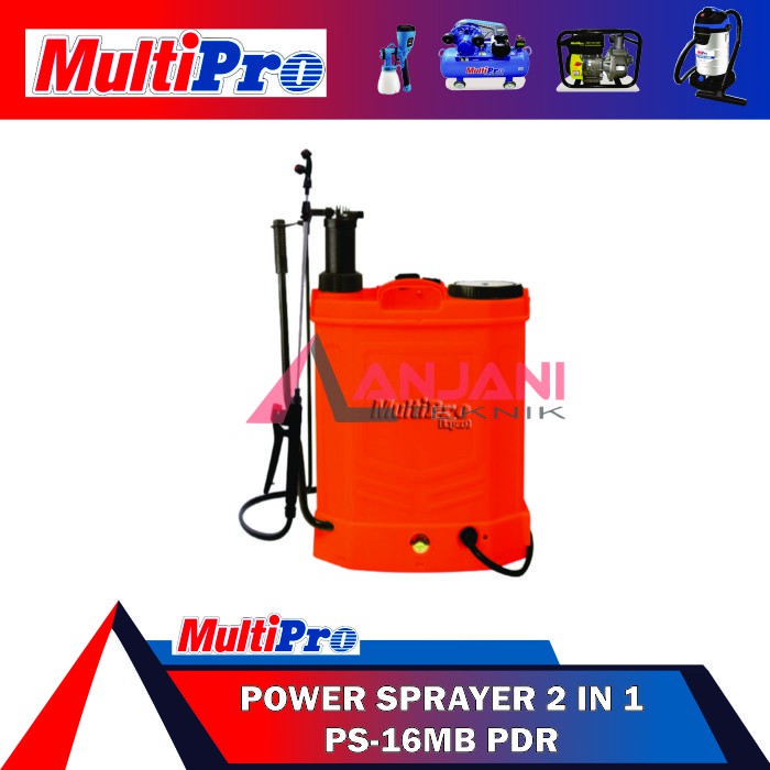 Deskripsi MULTIPRO PS 16 MB SEMPROT HAMA DISINFEKTAN ELEKTRIK SPRAYER 2IN1PRODUCT NUMBER : 4.PS.1.6MB.PDRMULTIPRO PS-16 MB PDR POWER SPRAYER 2 In 1 MANUAL DAN ELEKTRIKSPESIFIKASIPROFESSIONAL SERIES- MAX SPEED : 22000 RPM- AIR DELIVERY : 311 L / Min- DIMENSION : 38 x 21 x 52 Cm- MAX.PRESSURE : 5.5 Bar / 80 Psi- PRESSURE REGULATOR : YES- WORKING TIME : 4 - 5 Hours- NET WEIGHT : 6.3 Kg- GROSSS WEIGHT : 6.3 Kg- TANK CAPACITY : 16 Liter- AUTO PUMP MOTOR : DC Volt Meter- BATTERY INDICATOR : PRESSURE REGULATOR- BATTERY : 12 V